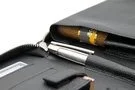 Внутренняя часть сумки представляет собой эффективно спроектированное пространство с карманами для различных аксессуаров, включая сигарный нож, прикуриватель, ручку или карандаш, и даже идентификационную или кредитную карту. Отделение для сигар вмещает широкий выбор различных форматов сигар, до 5-7 сигар размером Churchill. Эти сигары надежно удерживаются на месте кожаным клапаном, который имеет несколько позициймагнитного закрытия для более точной регулировки длины сигар.