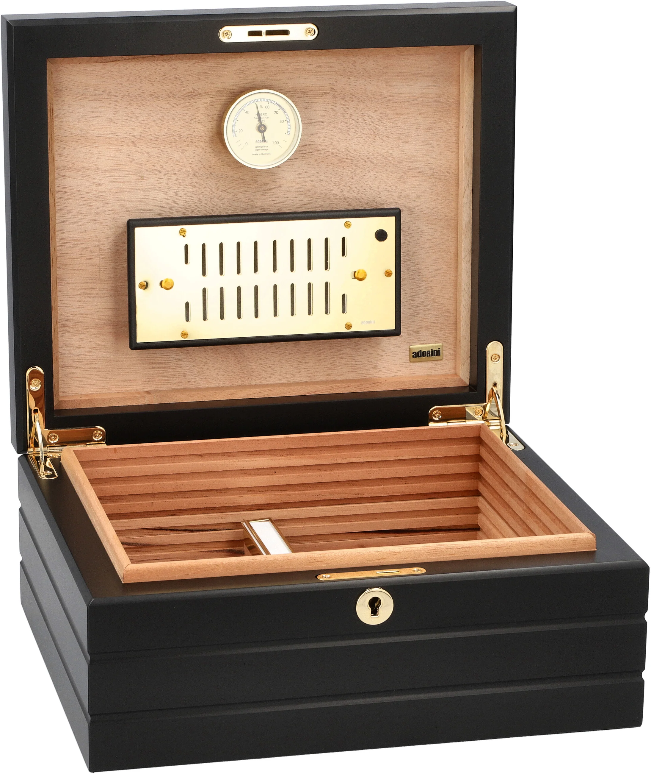 - укомплектован ысокоточным откалиброванным волосяным гигрометром и позолоченной увлажнительной системой Adorini Deluxe, основанной на акриловых полимерах