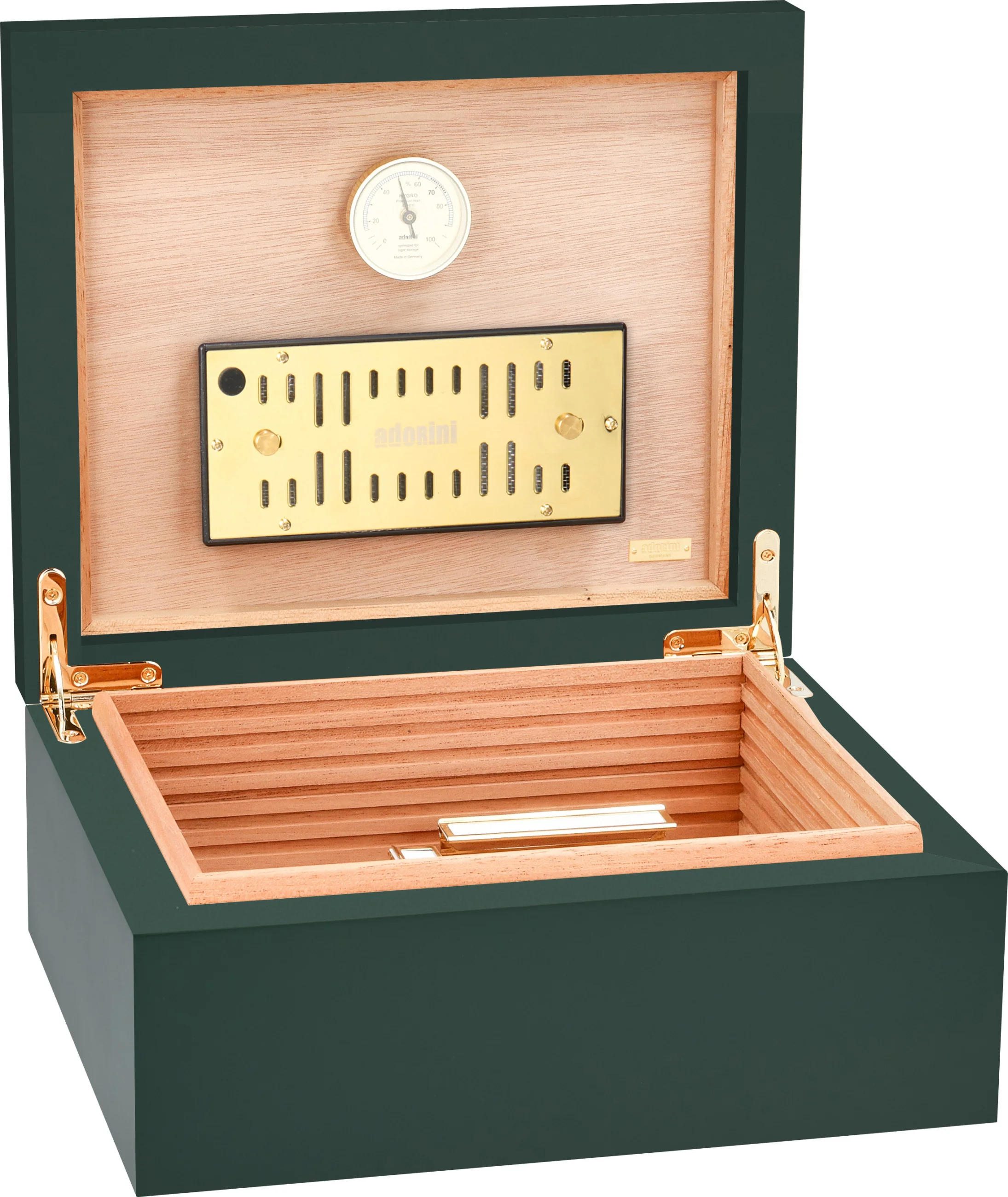 The adorini Humidor Medium Deluxe Imperial Green is part of the new adorini collection in four exciting color variations. This model impresses with a sophisticated, timeless dark green, enhanced by gold elements on the interior. Particularly noteworthy is the matte green soft-touch finish, which extends beyond the outer edge and is thus also visible on the interior. This gives the humidor a harmonious and elegant overall effect.