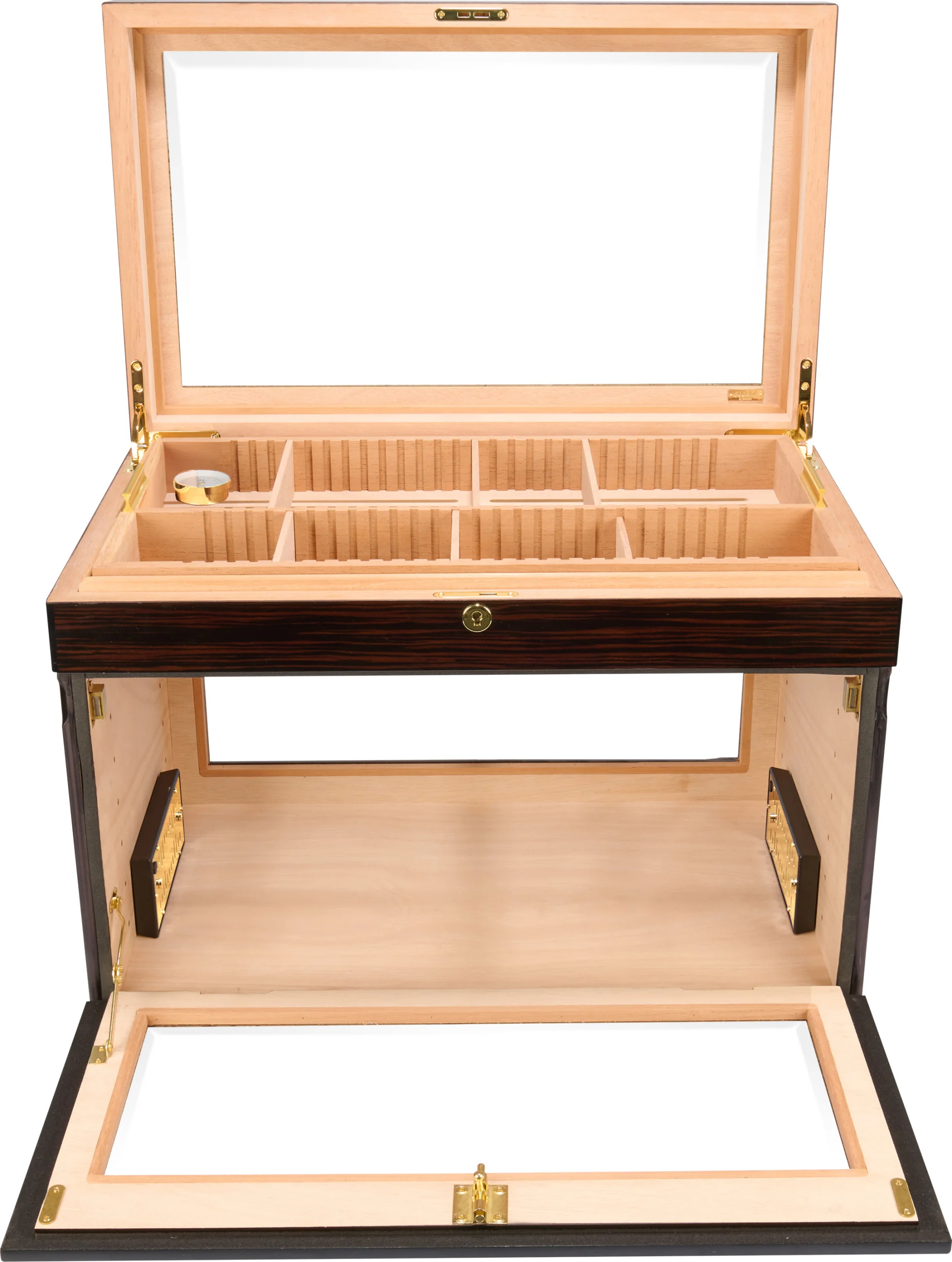 Multiple levels allow for the storage of individual cigars, boxes, or even entire cigar cases. The interior can be variably divided: