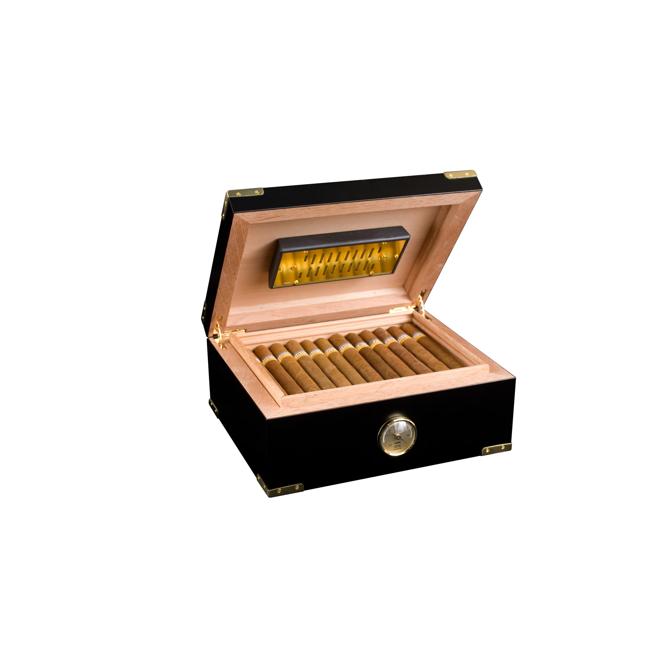 Поддержание необходимой влажности для span>до максимум 75 сигар размера Corona никогда не будет проблемой с увлажнителем на основе акрилового полимера, покрытого золотом. Этот мастерски изготовленный прибор регулируемыми вентиляционными отверстиями, благодаря которым вы сможете найти идеальный уровень влажности для ваших сигар. Увлажнитель прикреплен к нижней стороне крышки с помощью магнитов и металлической пластины, спрятанной под шпоном кедра, для оптимизации контроля пространства и влажности.
