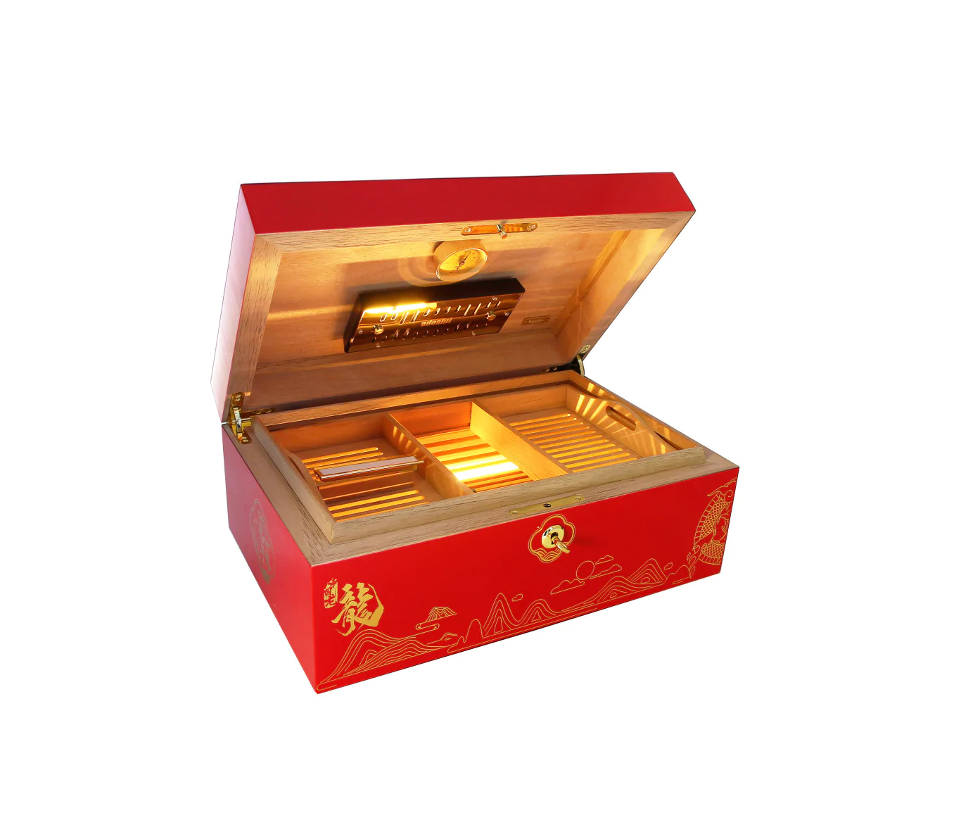 Дизайн этого хьюмидора глубокий и символичный. На крышке гордо возвышается золотой дракон, проработанный в мельчайших деталях. Каждая чешуйка дракона, какой бы маленькой она ни была, тщательно проработана и слегка приподнята. Дракон символизирует власть, амбиции и доминирование, а китайские иероглифы означают "Год Дракона", придавая хьюмидору дополнительное культурное значение.