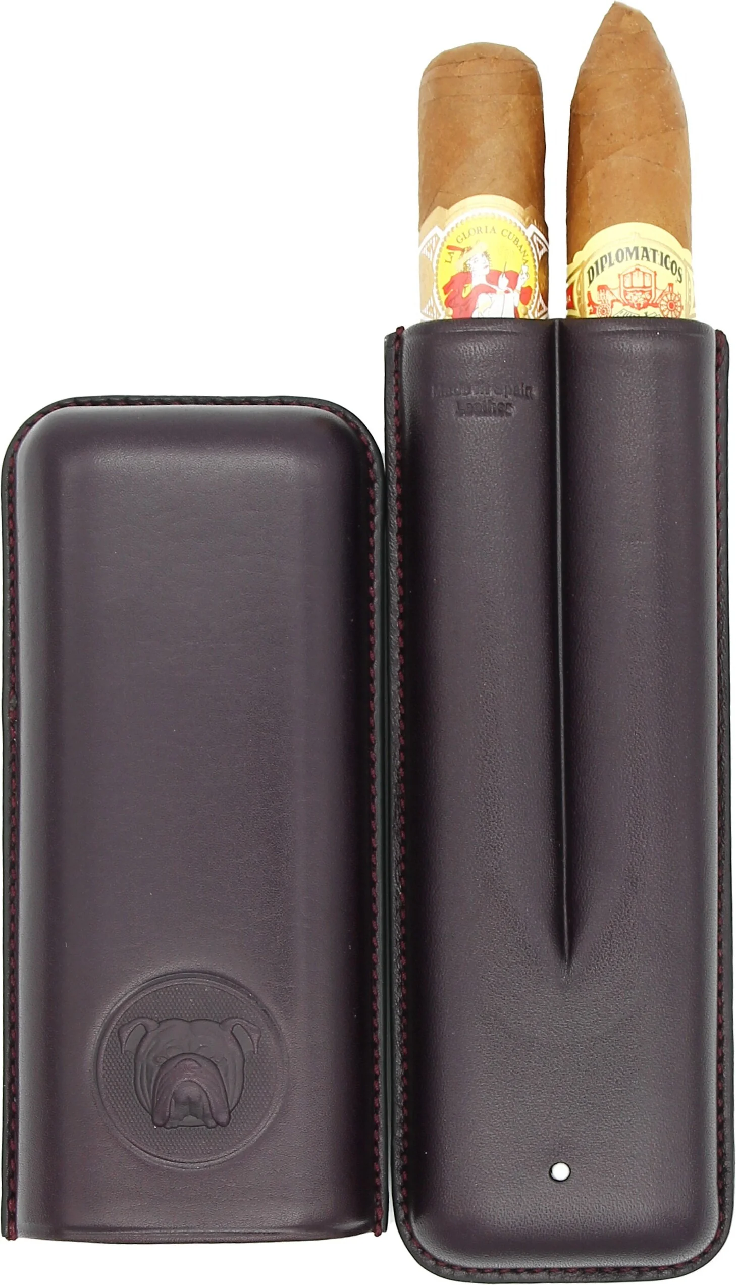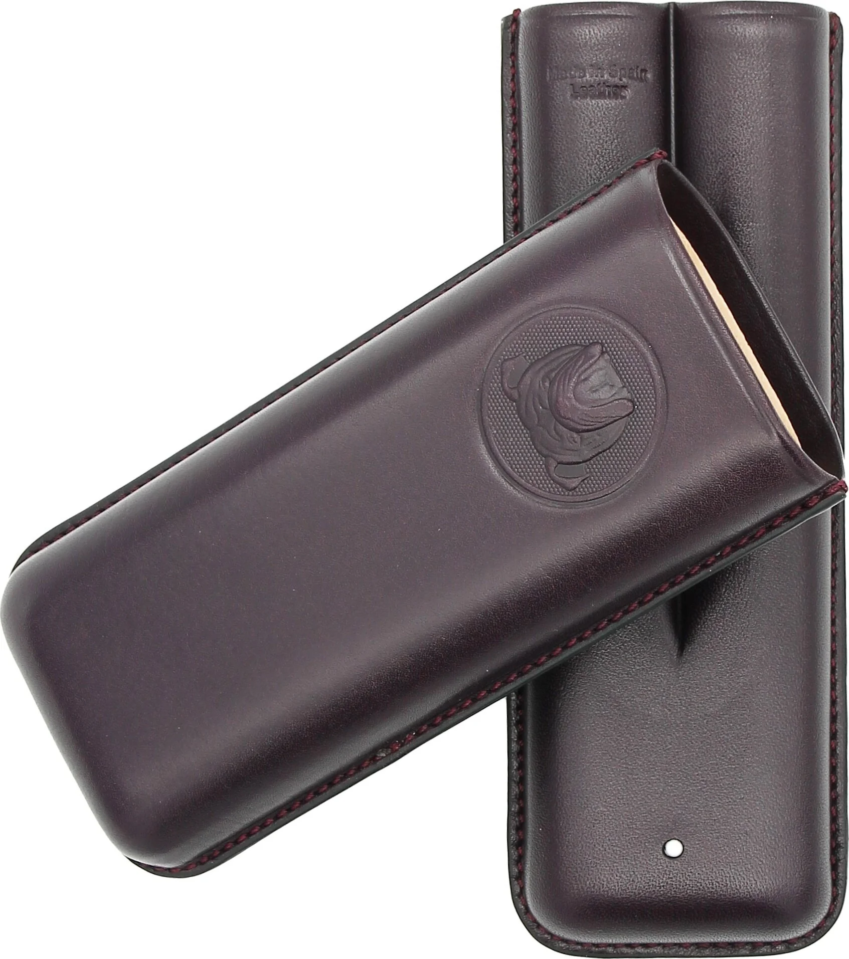 Inside, the case offers space for two cigars of different sizes. Practical notches ensure secure hold during transport. The interior is lined with soft, light-colored leather and reliably protects the cigars.
