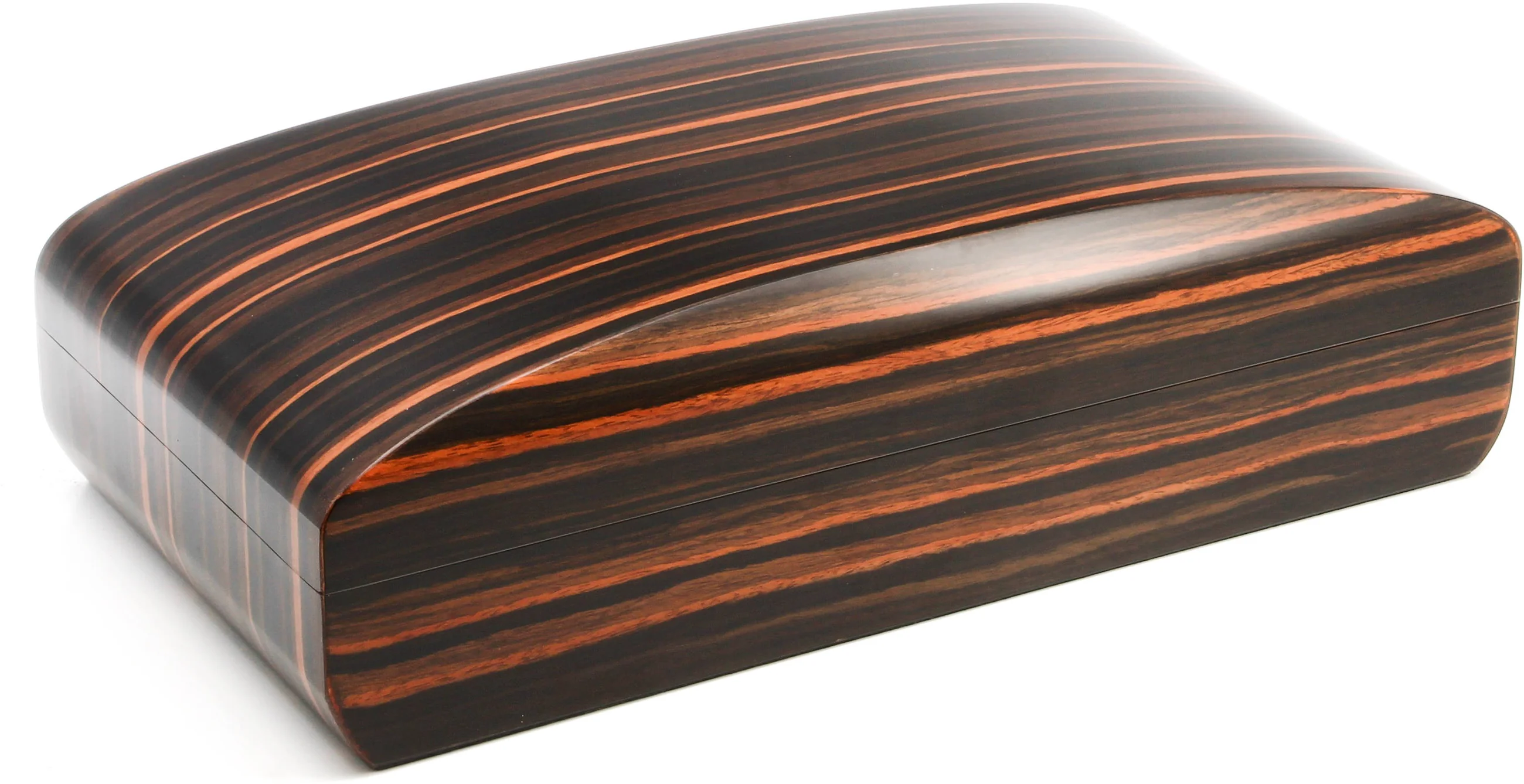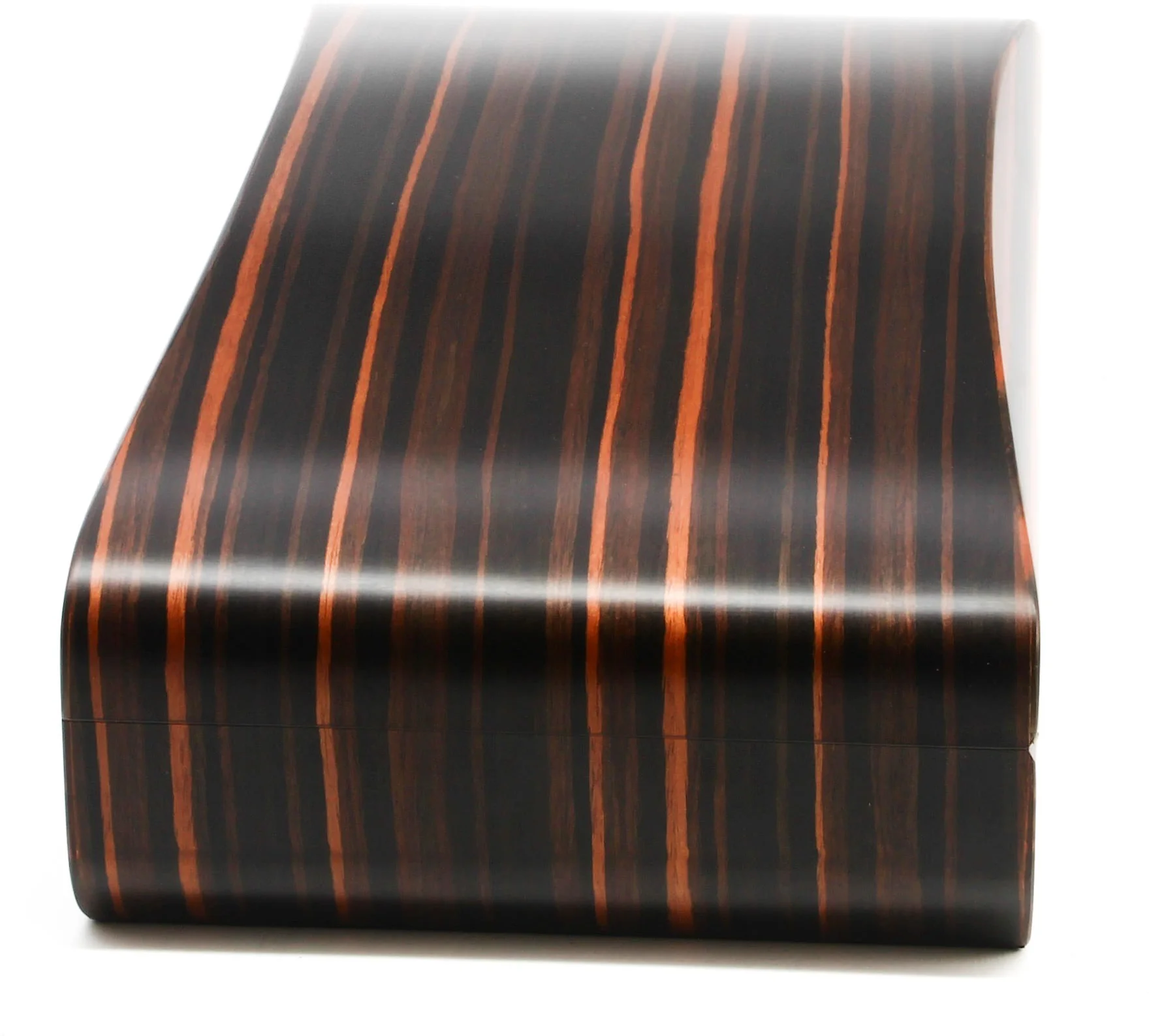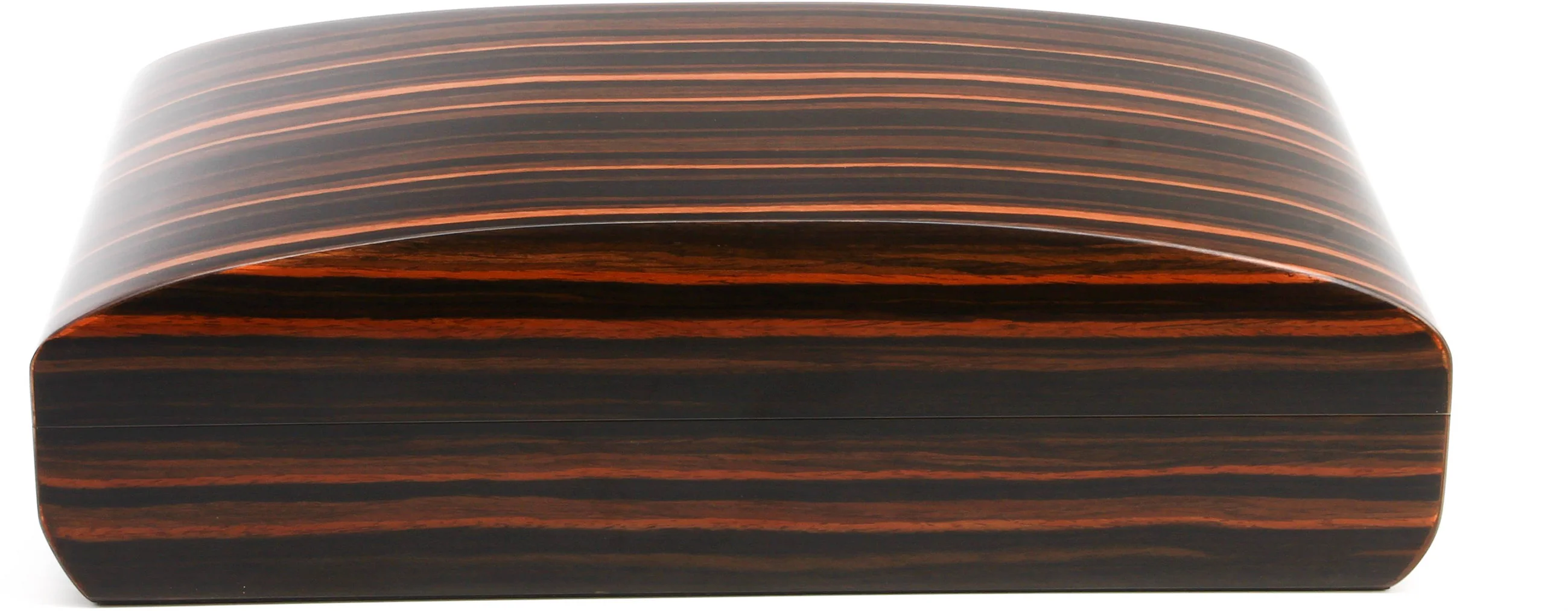 Благодаря своей вытянутой форме и чувственным изгибам, это потрясающее изделие далеко не похоже на обычный хьюмидор. Манящий шпон макассара волнует широкими мазками светлой и темной древесины, которая красиво перетекает в утонченную овальную форму хьюмидора.