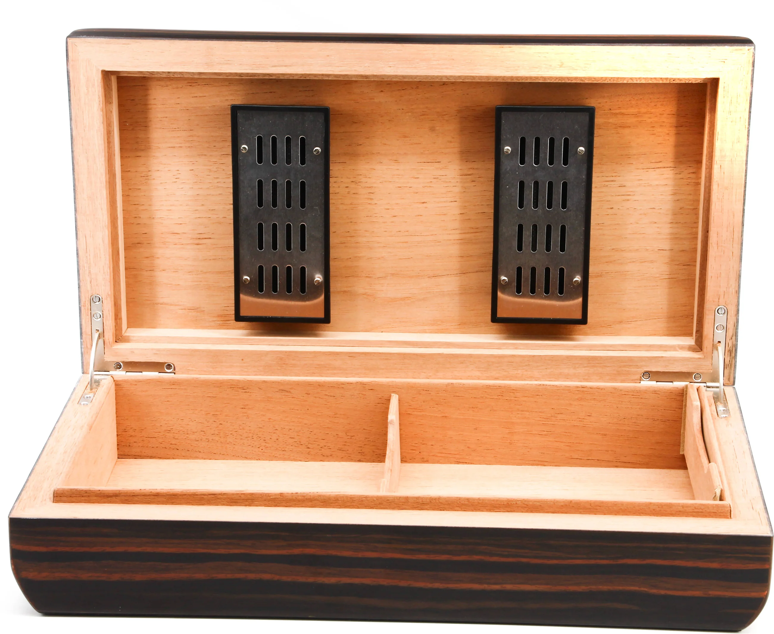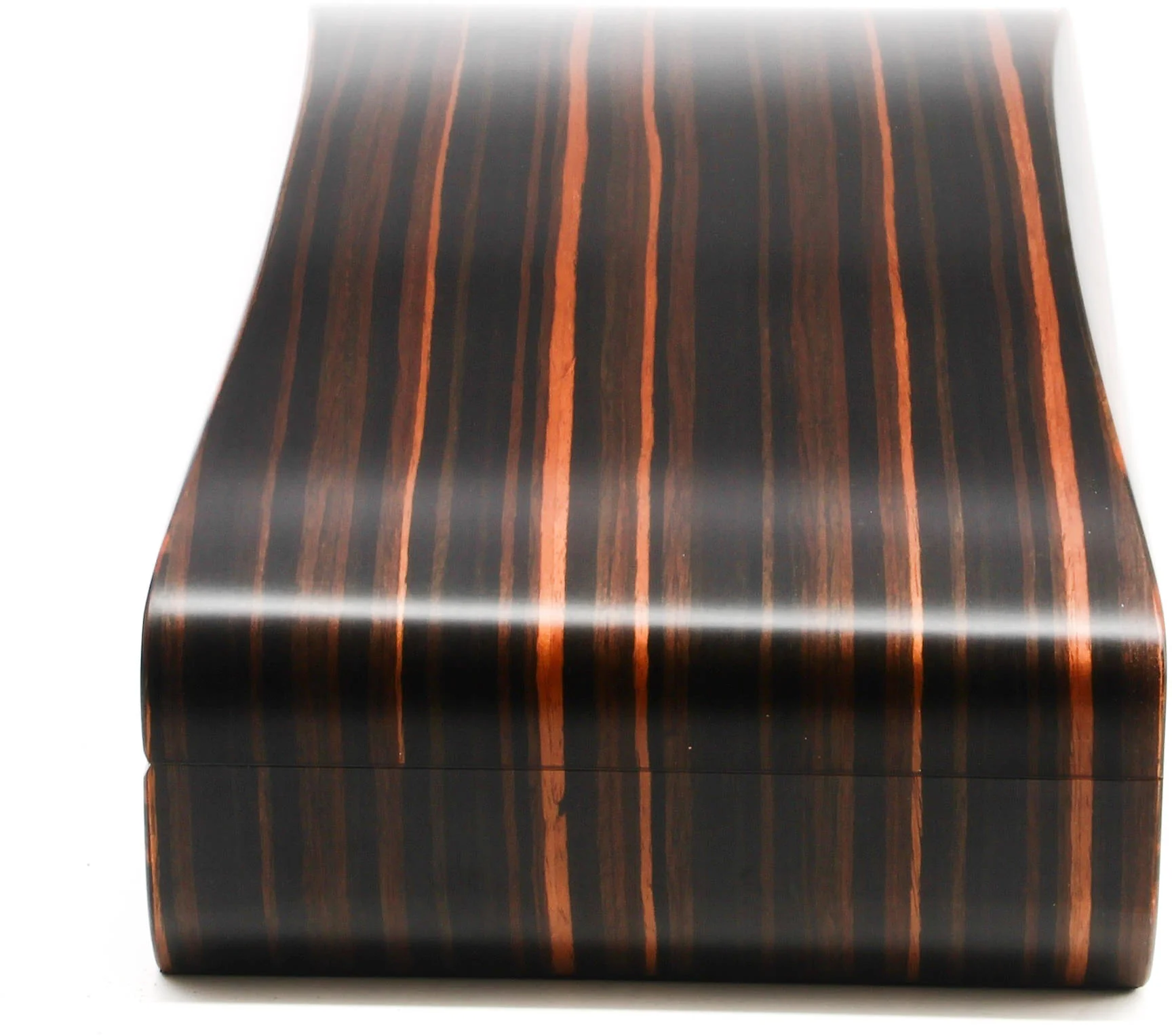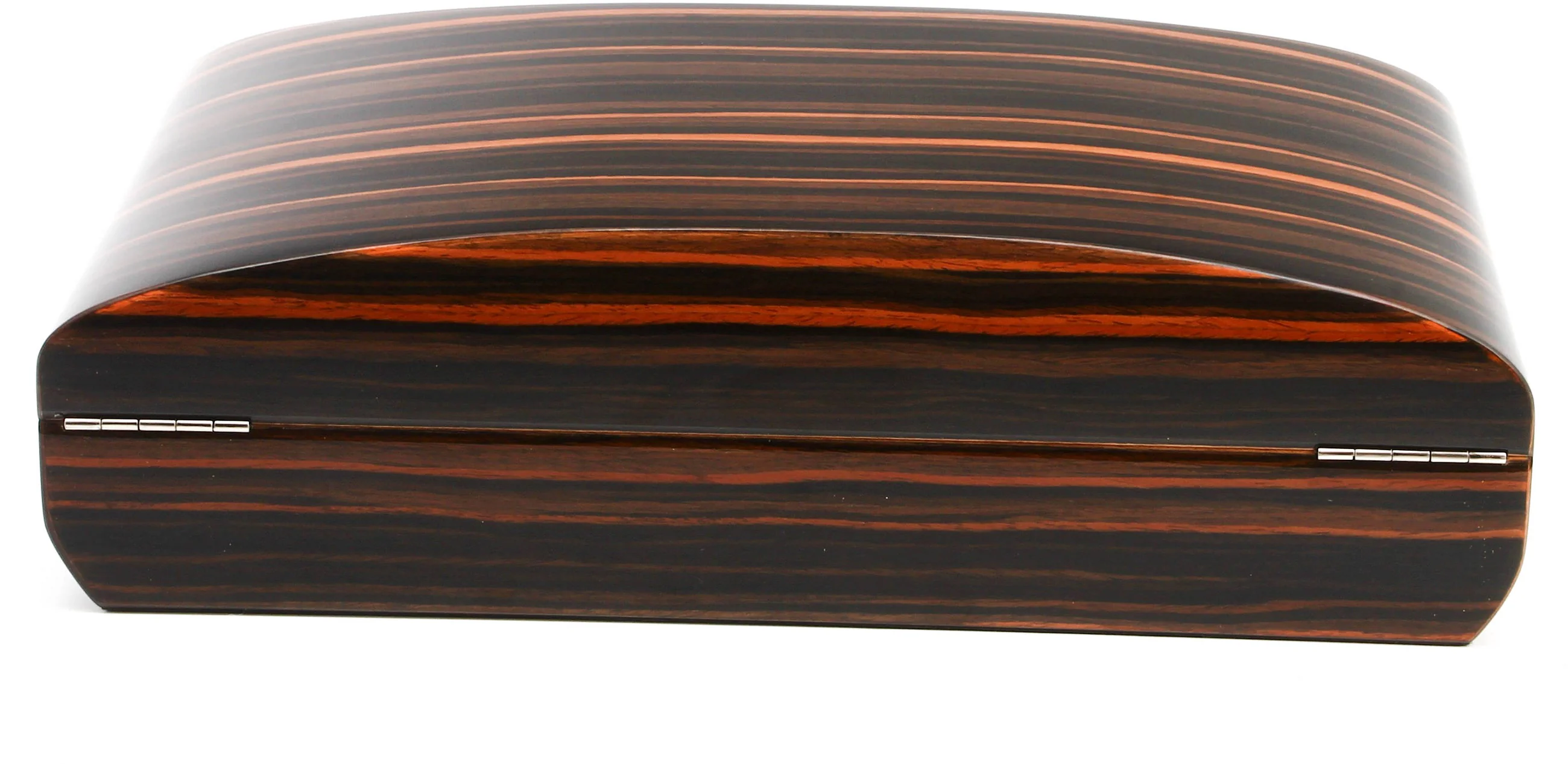 Благодаря своей вытянутой форме и чувственным изгибам, это потрясающее изделие далеко не похоже на обычный хьюмидор. Манящий шпон макассара волнует широкими мазками светлой и темной древесины, которая красиво перетекает в утонченную овальную форму хьюмидора.