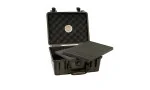 Изготовленный из прочного **твердого пластика**, хьюмидор почти напоминает чемодан. Он оснащен прочной ручкой и двумя **складными застежками**, которые делают его **водонепроницаемым и герметичным**. Кроме того, в передней части находится **клапан для выравнивания давления**, разработанный специально для авиаперелетов: если после полета хьюмидор трудно открыть из-за давления воздуха, этот клапан позволяет легко выровнять давление.